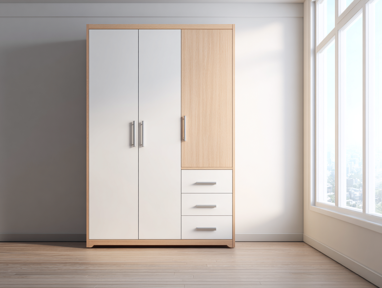 La struttura dell'armadio consente di organizzare abiti e accessori in modo ordinato. I cassetti inferiori offrono spazio utile per indumenti piegati o oggetti di uso quotidiano. Il design lineare si adatta facilmente a camere da letto con stile moderno o minimalista.