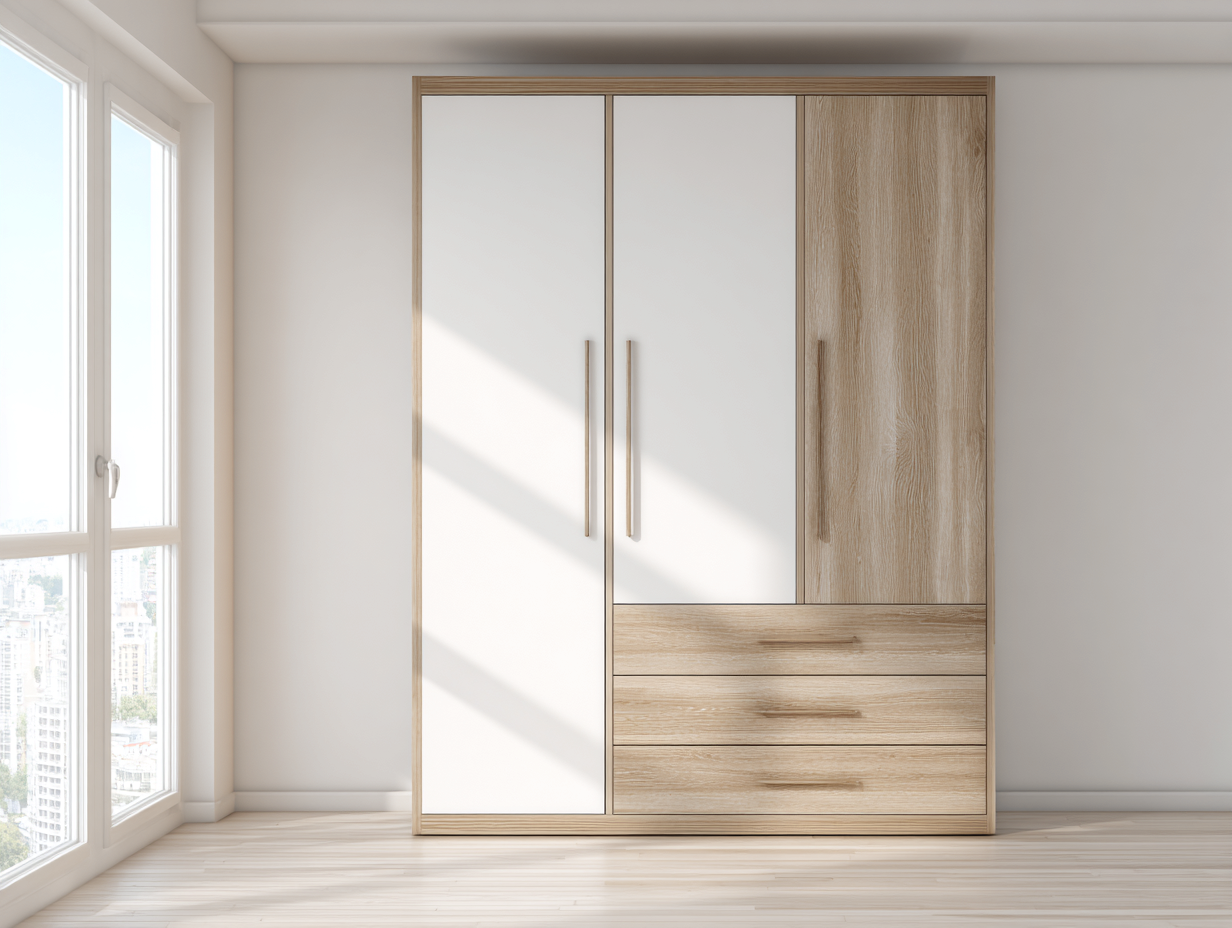La struttura dell'armadio consente di organizzare abiti e accessori in modo ordinato. I cassetti inferiori permettono di riporre indumenti piegati o oggetti di uso quotidiano. Il design verticale permette di sfruttare lo spazio della stanza mantenendo un aspetto pulito e moderno.